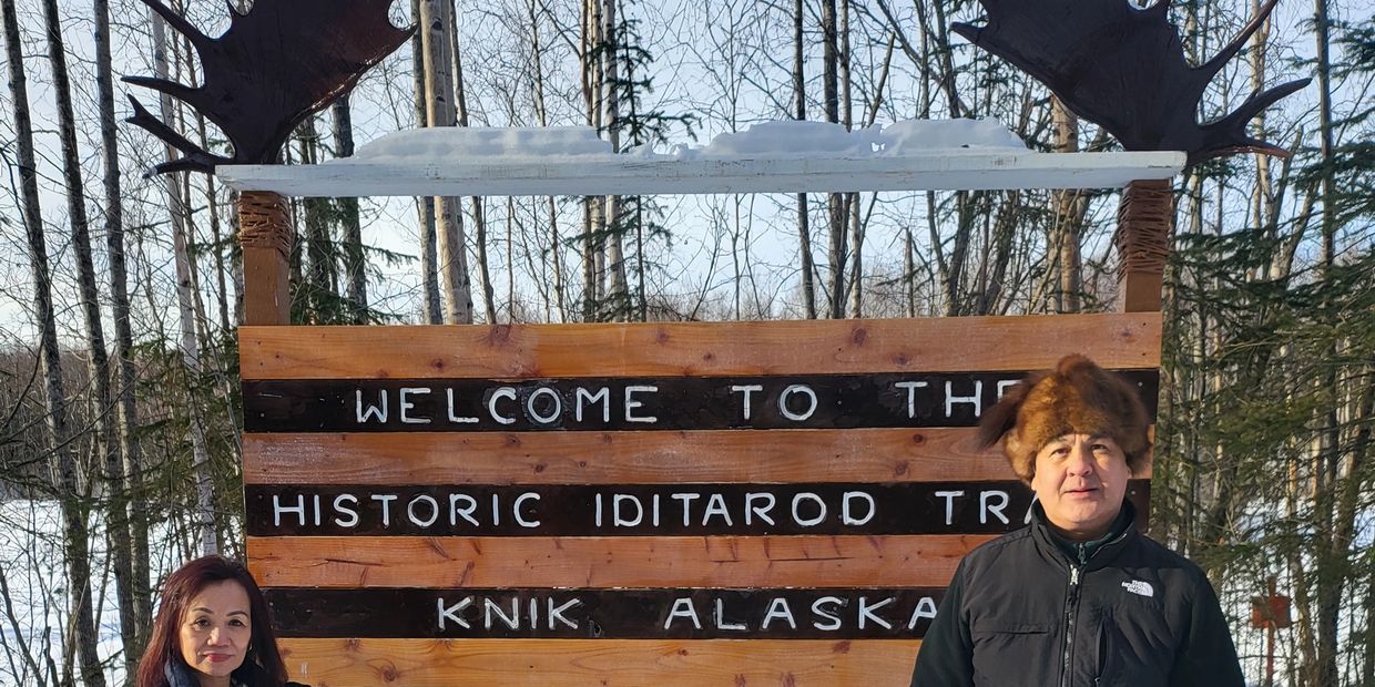 Featured here are Lil and Manny Wrase near the start of the annual Iditarod Trail Invitational (ITI), the world’s longest-running winter ultra-marathon. It is here that a determined group of athletes sets out from Knik Lake to traverse the historic trail on foot, fat bike, or skis. The event offers two primary challenges: a 350-mile journey over the rugged Alaska Range to the interior village of McGrath, and the ultimate 1,000-mile odyssey that continues all the way to the finish line in Nome. These competitors must be entirely self-sufficient, hauling all their own survival gear through some of the harshest winter conditions on the planet. Adding a personal touch to the trail's history, the iconic moose antlers adorning the Iditarod sign were donated by Manny several years ago. These impressive antlers were a trophy from a successful hunt in McGrath shared by Manny and his brother, now serving as a permanent landmark for racers and fans alike.